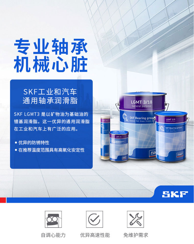SKF工业和汽车通用轴承润滑脂 SKF润滑脂是以矿物油为基础油的锂基润滑脂。这一优异的通用润滑脂在工业和汽车上有广泛的应用...